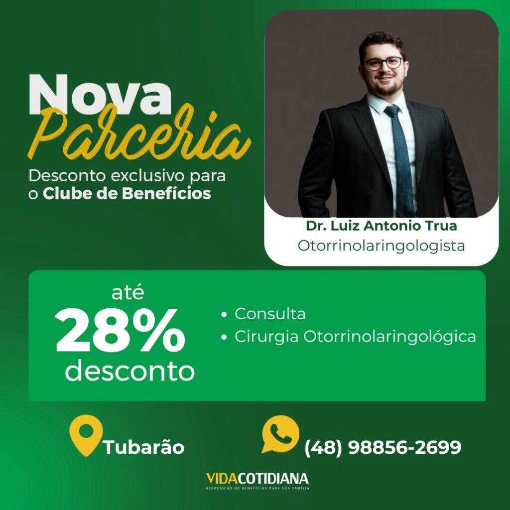 Mais uma novidade para você associado! Agora, você e seus dependentes tem a oportunidade de aproveitar descontos de até 28% em consultas e 10% em cirurgias com Dr. Luiz Antonio Trua em Tubarão, Jaguaruna, Laguna e Imbituba. Contato: (48) 98856-2699 Atuando nos segmentos: Consulta Cirurgia Otorrinolaringológica Estamos constantemente expandindo nossa lista de parceiros para garantir […]