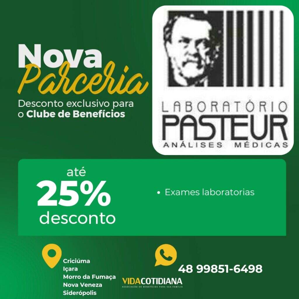 Mais uma novidade para você associado! Agora, você e seus dependentes tem a oportunidade de aproveitar descontos de até 25% em nossas unidades do Laboratório Pasteur. Contato: (48) 99851-6498 Cidades: Criciúma Içara Morro da Fumaça Nova Veneza Siderópolis Estamos constantemente expandindo nossa lista de parceiros para garantir que você tenha cada vez mais vantagens […]