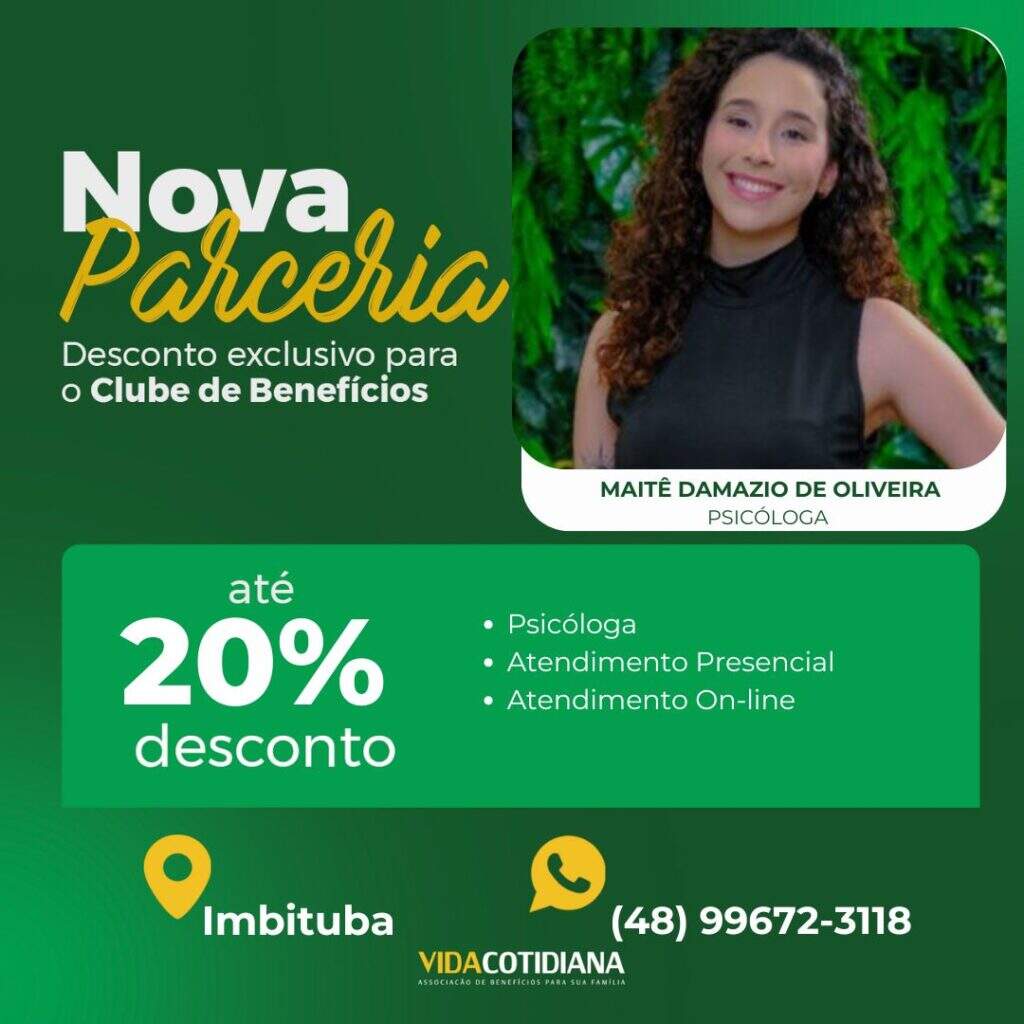 Mais uma novidade para você associado! Agora, você e seus dependentes tem a oportunidade de aproveitar descontos de até 20% com Psicóloga Maitê Damazio de Oliveira em Imbituba. Contato: (48) 99672-3118 Atendimento Presencial e On-line Estamos constantemente expandindo nossa lista de parceiros para garantir que você tenha cada vez mais vantagens como membro da Vida […]