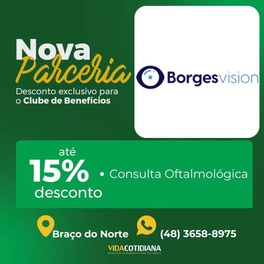 Mais uma novidade para você associado! Agora, você e seus dependentes tem a oportunidade de aproveitar descontos de até 15% com a BorgesVision Clínica e Cirurgia de Olhos, com Consultas Oftalmológicas. Contato: (48) 3658-8975 Estamos constantemente expandindo nossa lista de parceiros para garantir que você tenha cada vez mais vantagens como membro da Vida Cotidiana. […]