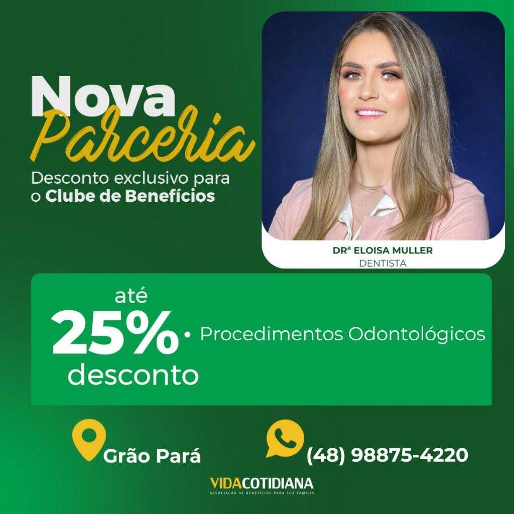 Mais uma novidade para você associado! Agora, você e seus dependentes tem a oportunidade de aproveitar descontos de até 25% com a Drª Eloisa Muller, com procedimentos odontólogicos. Contato: (48) 98875-4220 Estamos constantemente expandindo nossa lista de parceiros para garantir que você tenha cada vez mais vantagens como membro da Vida Cotidiana. Entre em contato […]