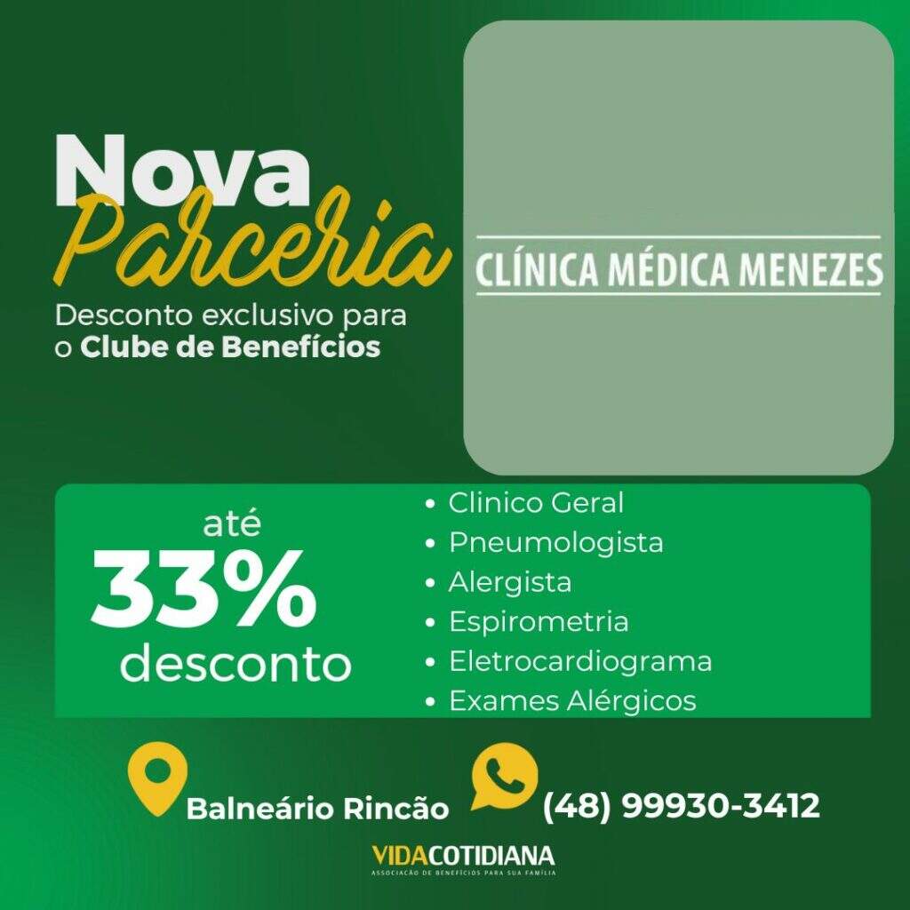 Mais uma novidade para você associado! Agora, você e seus dependentes tem a oportunidade de aproveitar descontos de até 33% com a Clínica Médica Menezes, com Clinico Geral , Pneumologista , Alergista , Espirometria , Eletrocardiograma e Exames Alérgicos. Contato: (48) 99930-3412 Estamos constantemente expandindo nossa lista de parceiros para garantir que você tenha cada […]