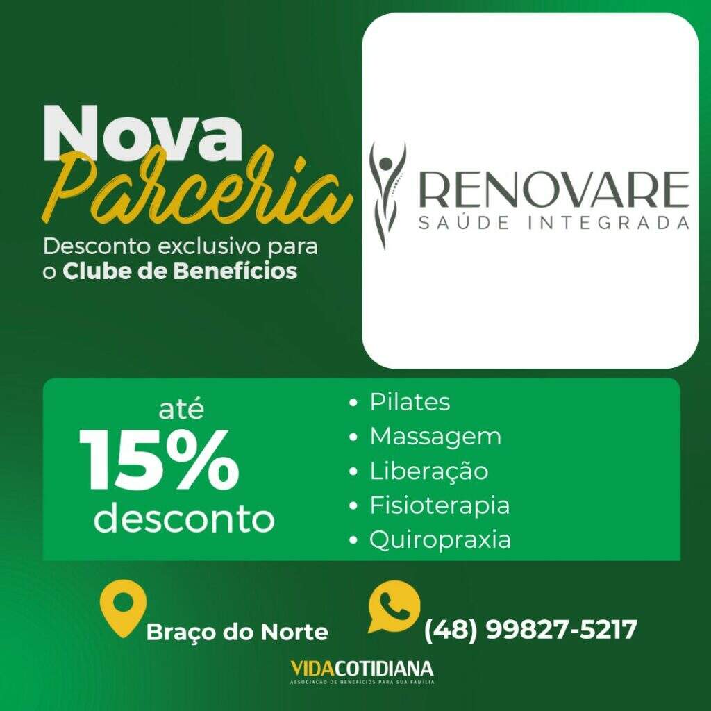 Mais uma novidade para você associado! Agora, você e seus dependentes tem a oportunidade de aproveitar descontos de até 15% com a Renovare Saúde Integrada, com Pilates, Massagem , Liberação, Fisioterapia e Quiropraxia. Contato: (48) 99827-5217 Estamos constantemente expandindo nossa lista de parceiros para garantir que você tenha cada vez mais vantagens como membro da […]