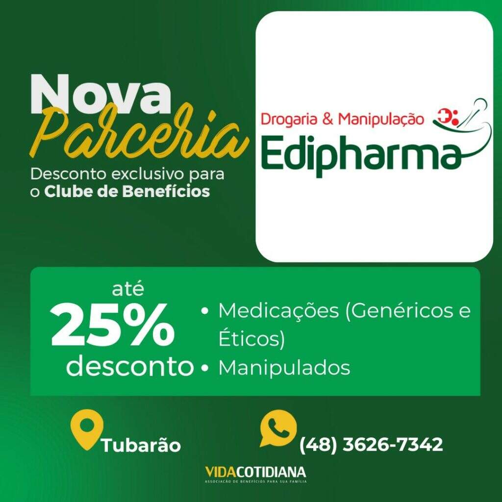 Mais uma novidade para você associado! Agora, você e seus dependentes tem a oportunidade de aproveitar descontos de até 25% com a Edipharma Drogaria e Farmácia Manipulação, em Medicações (Genéricos e Éticos)e em Manipulados. Contato: (48) 3626-7342 Estamos constantemente expandindo nossa lista de parceiros para garantir que você tenha cada vez mais vantagens como membro […]