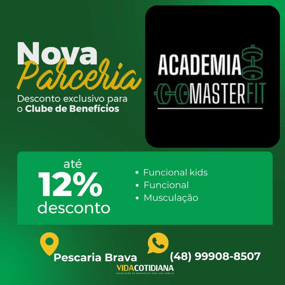 Agora, você e seus dependentes tem a oportunidade de aproveitar descontos de até 12% nas mensalidades na Academia Masterfit em Pescaria Brava.