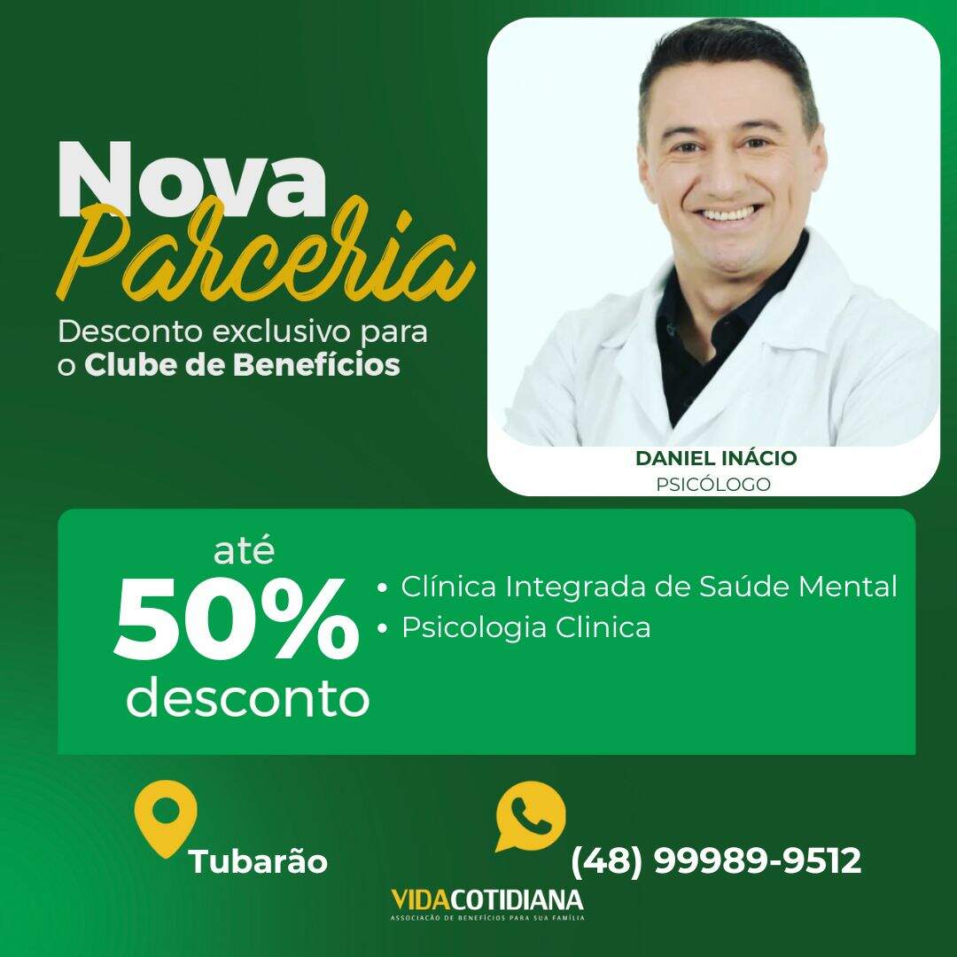 Agora, você e seus dependentes tem a oportunidade de aproveitar descontos de até 50% com Clínica Integrada de Saúde Mental | Psicólogo Daniel Inácio em Tubarão.