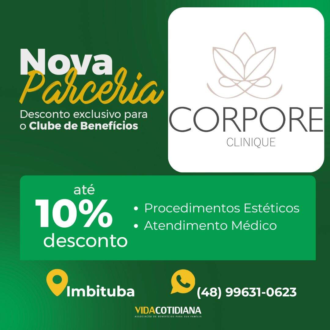 Agora, você e seus dependentes tem a oportunidade de aproveitar descontos de até 10% com a Corpore Clinique em procedimento estético e atendimento médico.