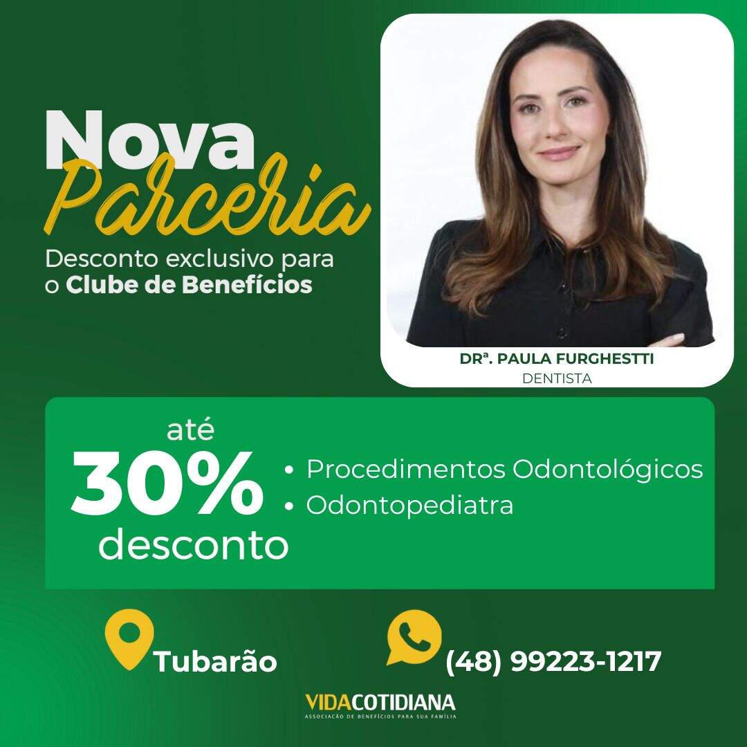 Agora, você e seus dependentes tem a oportunidade de aproveitar descontos de até 30% com a Dentista Drª. Paula Furghestti, em Procedimentos Odontológicos e Odontopediatria.