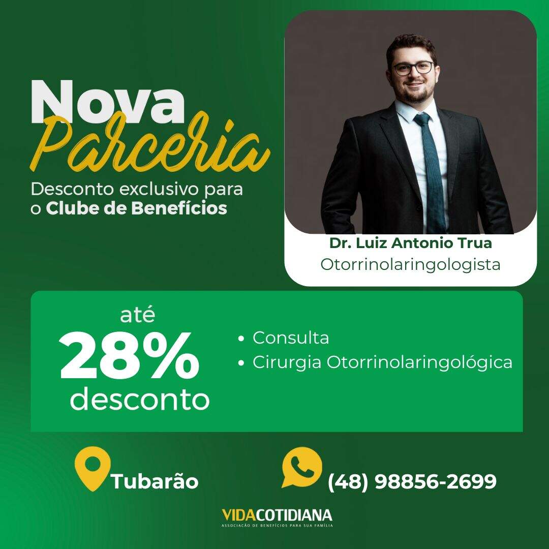 Agora, você e seus dependentes tem a oportunidade de aproveitar descontos de até 28% em consultas e 10% em cirurgias com Dr. Luiz Antonio Trua em Tubarão, Jaguaruna, Laguna e Imbituba.