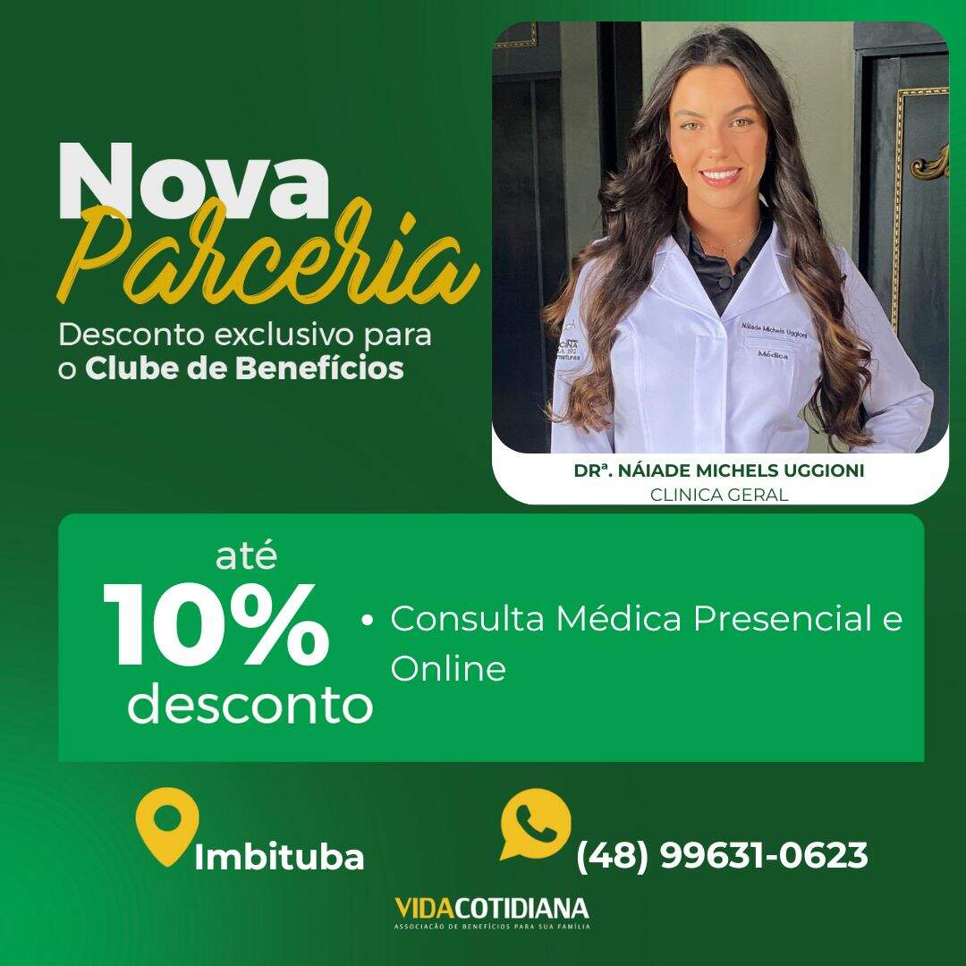 Agora, você e seus dependentes tem a oportunidade de aproveitar descontos de até 10% com a Drª. Náiade Michels Uggioni, com Consulta médica Presencial e Online.