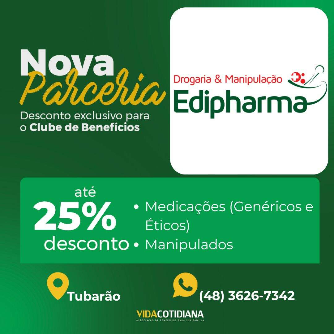 Agora, você e seus dependentes tem a oportunidade de aproveitar descontos de até 25% com a Edipharma Drogaria e Farmácia Manipulação, em Medicações (Genéricos e Éticos)e em Manipulados.