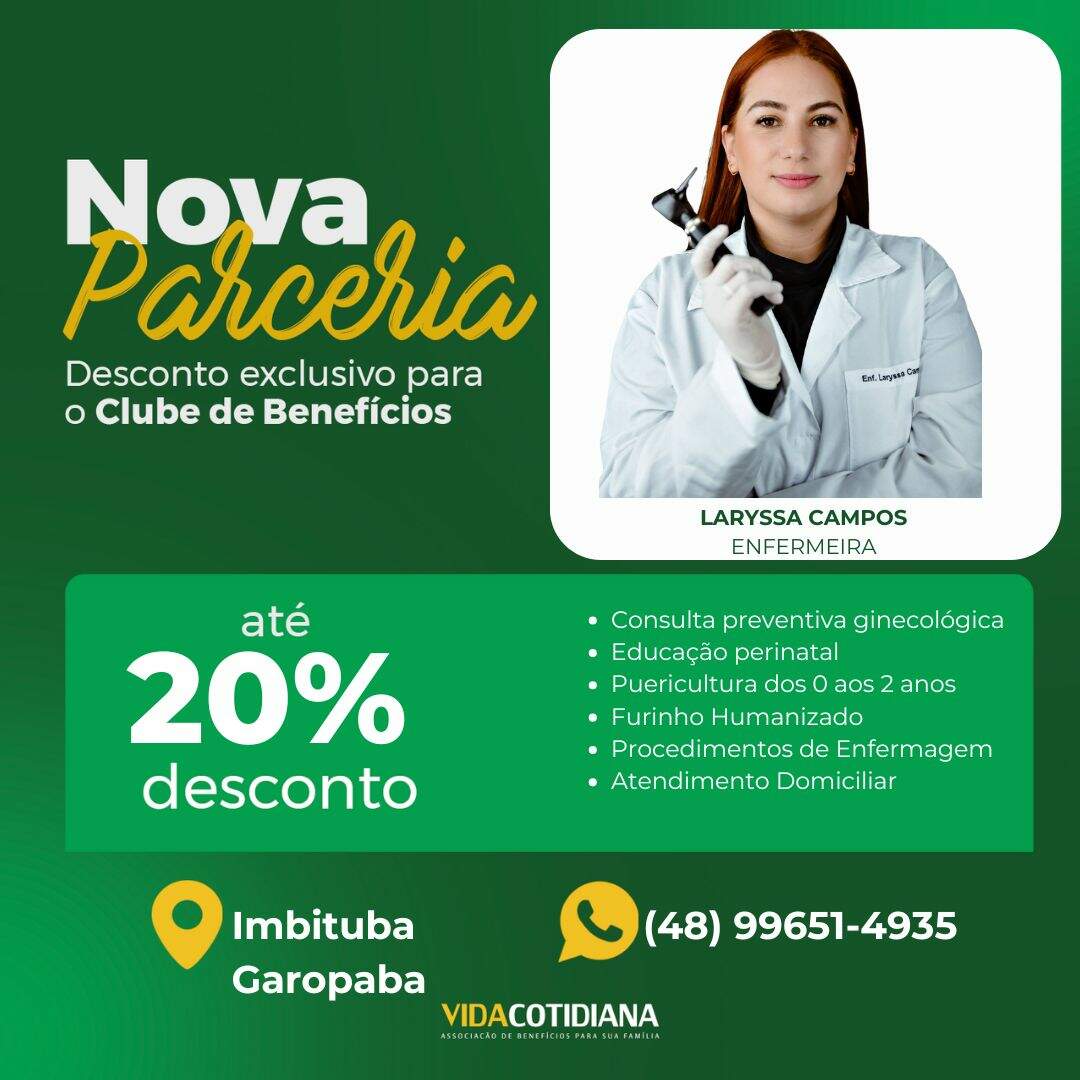 Agora, você e seus dependentes tem a oportunidade de aproveitar descontos de até 20% com Enfermeira Laryssa Campos em Imbituba e Garopaba.