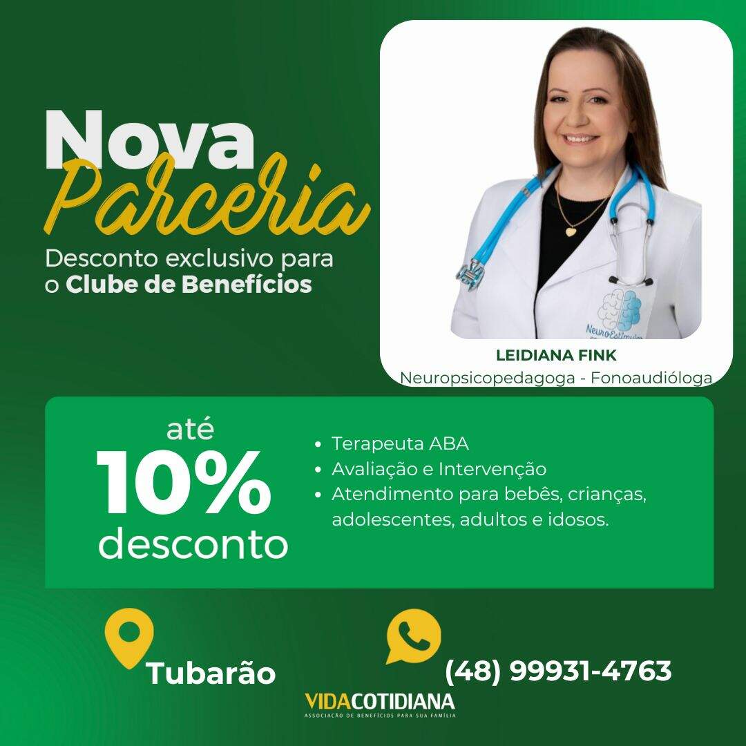 Agora, você e seus dependentes tem a oportunidade de aproveitar descontos de até 10% com Leidiana Fink – Neuropsicopedagoga – Fonoaudióloga em Tubarão.