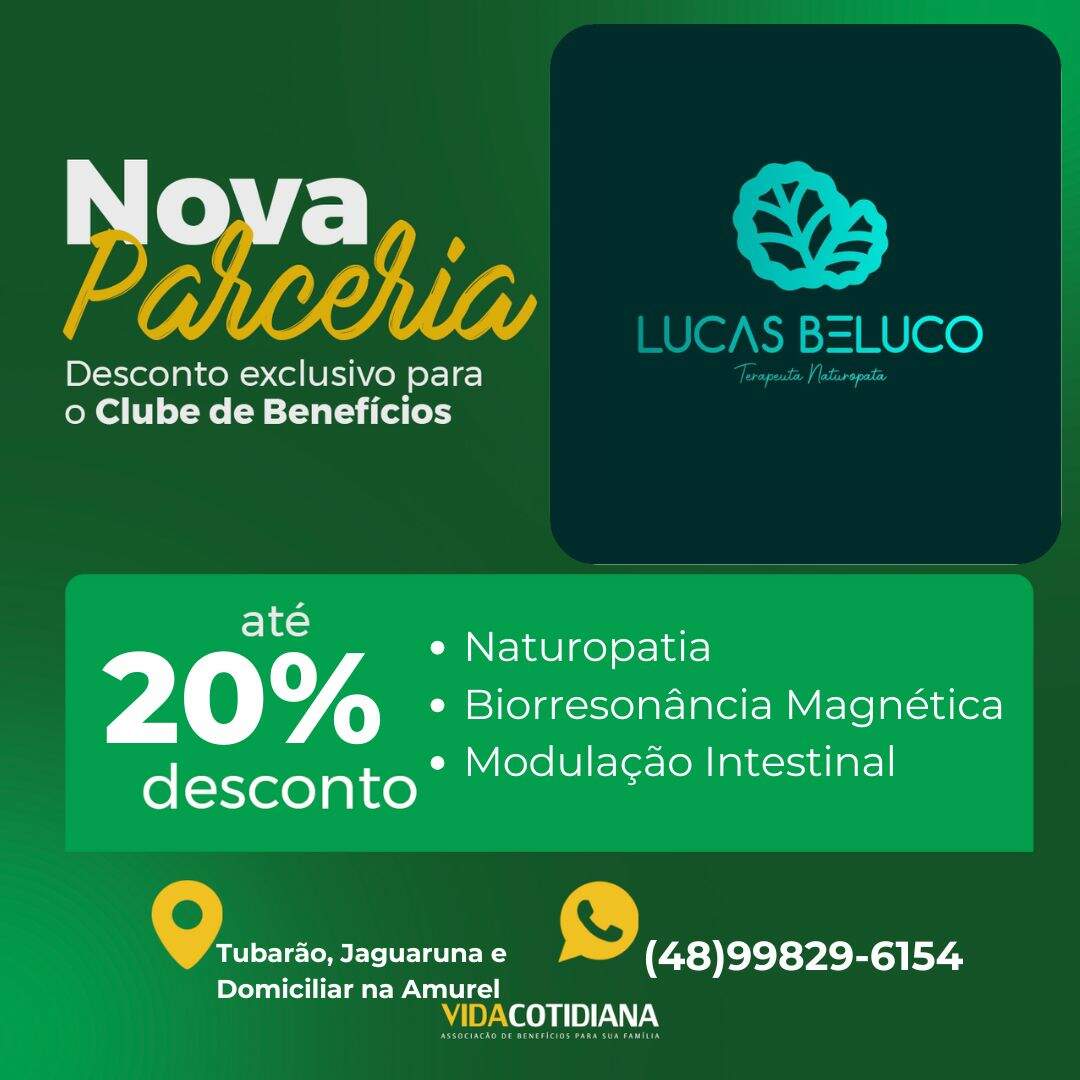 Agora, você e seus dependentes tem a oportunidade de aproveitar descontos de até 20% com o Lucas Beluco Naturopata em Naturopatia , Biorresonância Magnética e Modulação Intestinal.