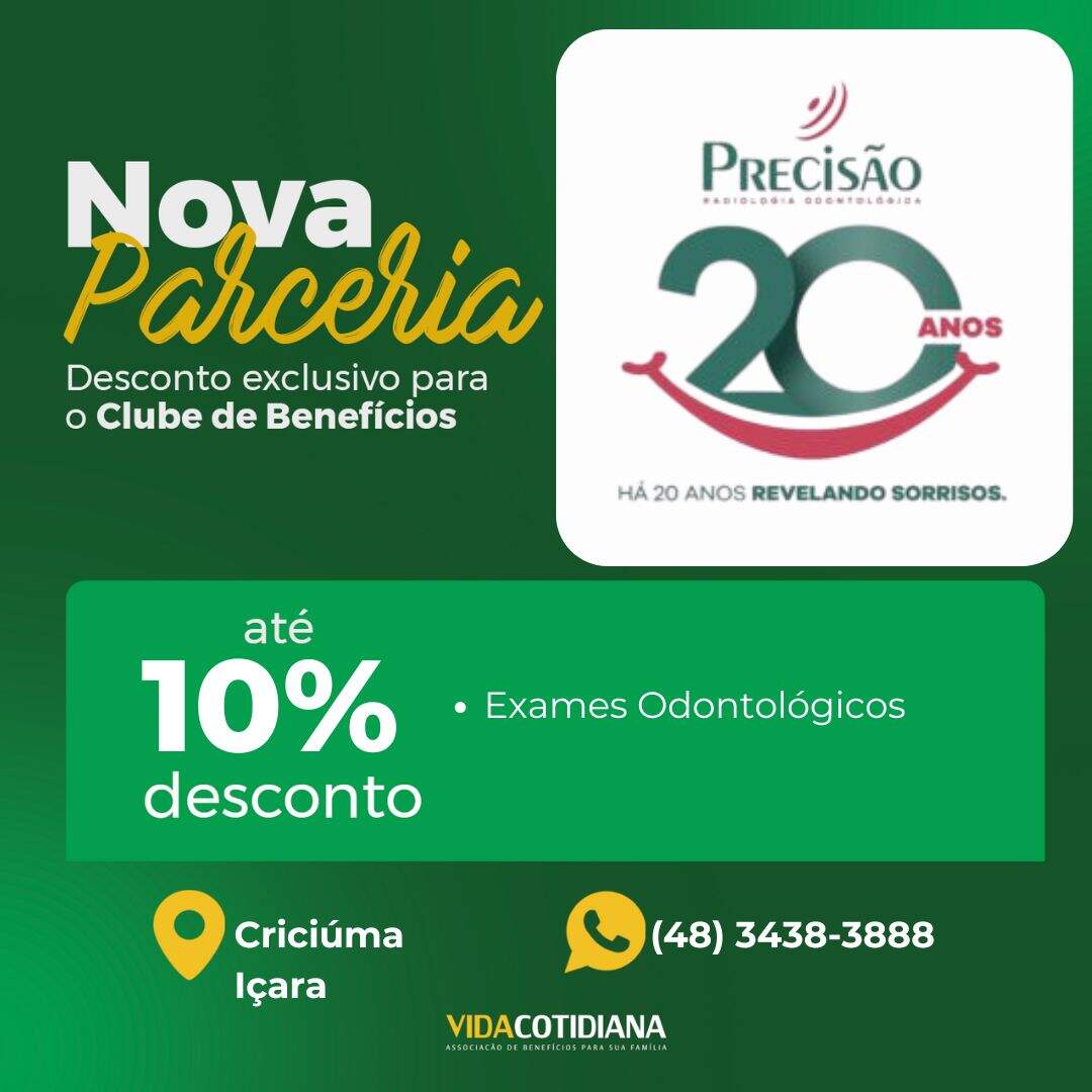 Agora, você e seus dependentes tem a oportunidade de aproveitar descontos de até 10% com Precisão Radiologia Odontológica, em Criciúma e Içara.