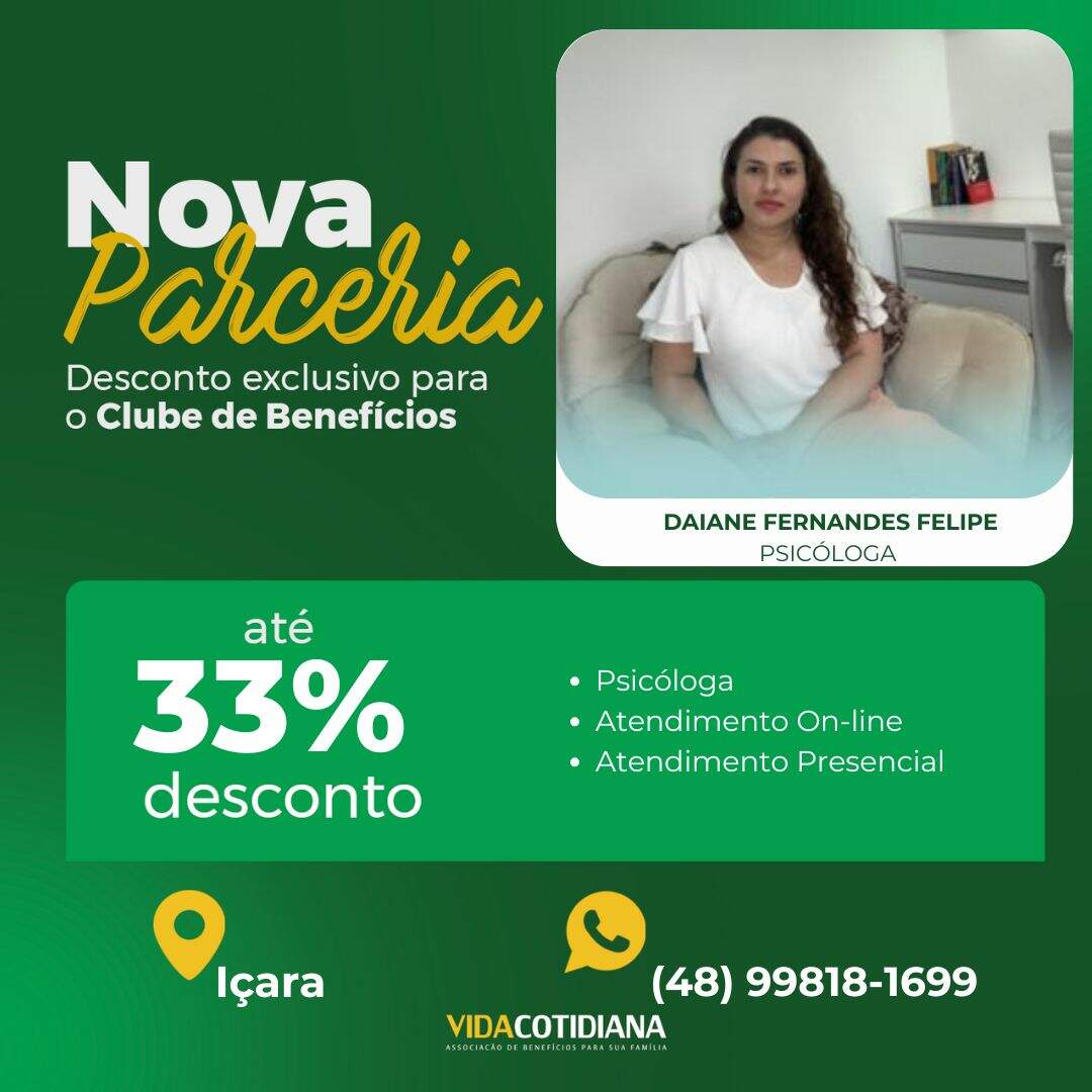 Agora, você e seus dependentes tem a oportunidade de aproveitar descontos de até 33% com Psicóloga Daiane Fernandes Felipe em Içara.