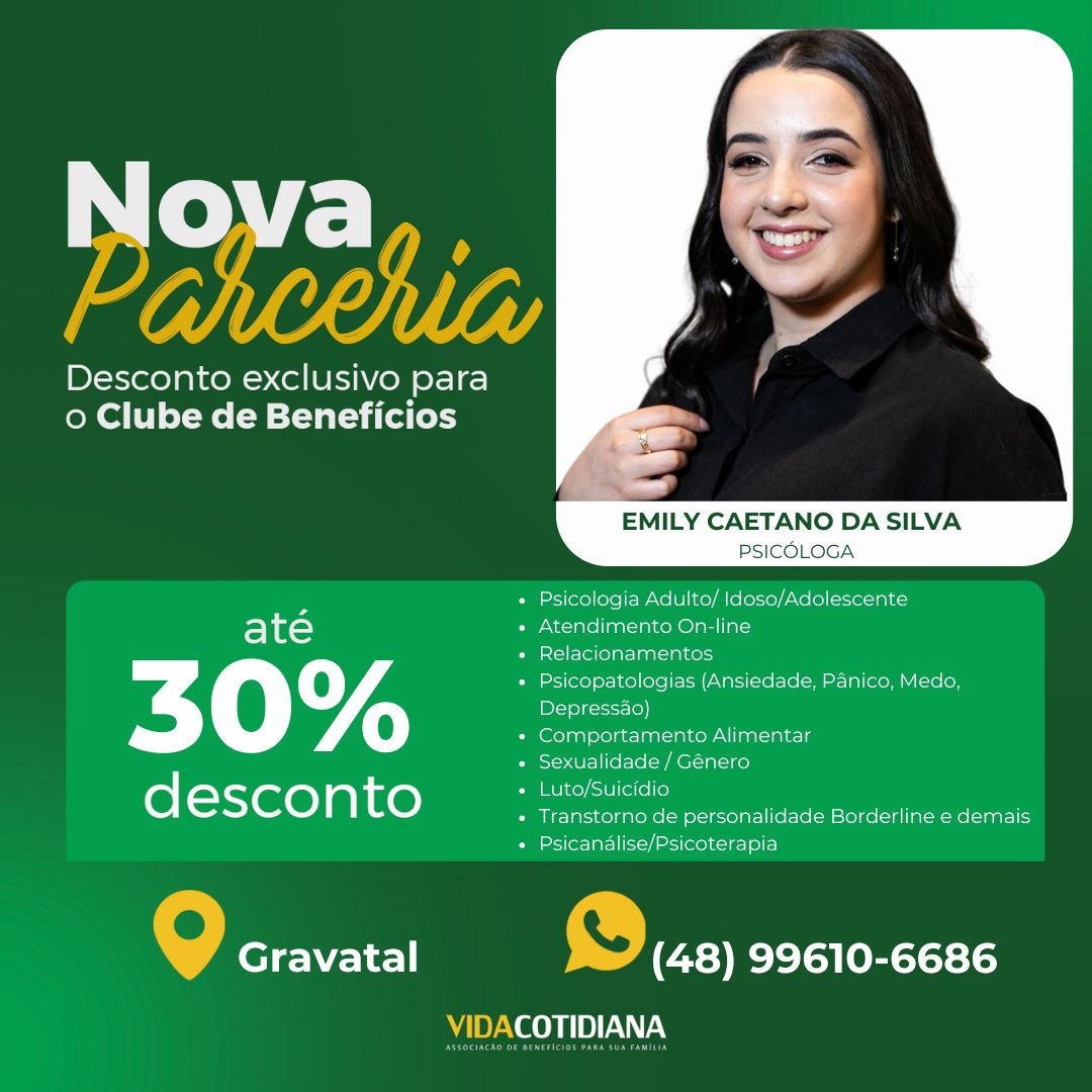 Agora, você e seus dependentes tem a oportunidade de aproveitar descontos de até 30% com a Psicóloga Emily Caetano da Silva em Gravatal.