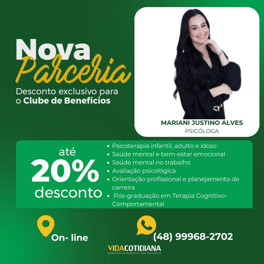 Agora, você e seus dependentes tem a oportunidade de aproveitar descontos de até 20% com Psicóloga Mariani Justino Alves forma on-line.