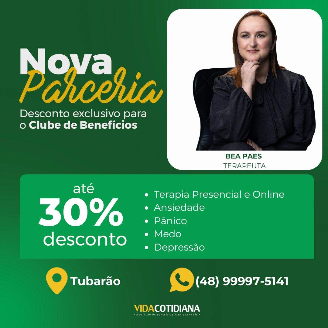 Agora, você e seus dependentes tem a oportunidade de aproveitar descontos de até 30% com a Terapeuta Bea Paes em Tubarão.
